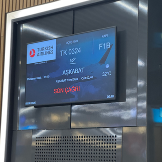Iškeliaujam keturiese. Skrydis per Stambulą į Ašchabadą patogus ir neprailgsta. Iš Vilniaus pakilę apie 20 val., apie 6 val. ryto, vietos laiku, mes jau leidžiamės Ašchgabade. Oro uostas - naujas, didelis, tvarkingas, vakarų žiniasklaidoje dažnai linksniuojamas dėl labai didelės statybos kainos (virš 2 mlrd. Eur).